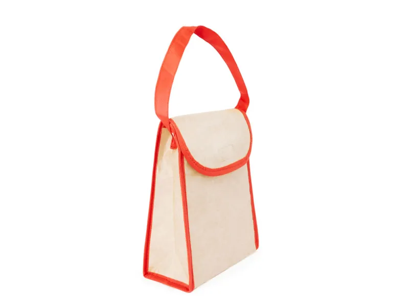 Сумка-холодильник из ламинированной бумаги с изотермической алюминиевой подкладкой и изоляционной пеной толщиной 2 мм. Ручка 60 см и клапан с застежкой-липучкой. Окантовка на сумке и ручке в тон