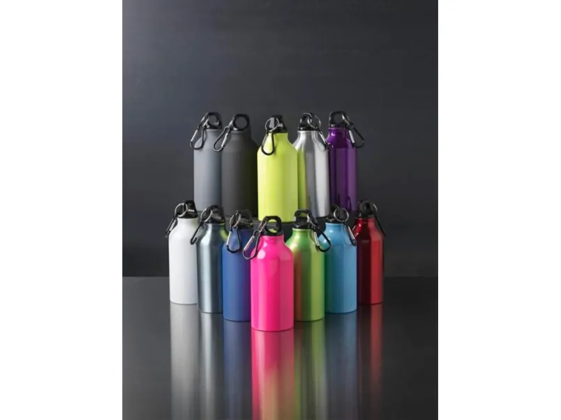 Матовая спортивная бутылка Oregon с карабином и объемом 400 мл. Бутылка с одинарными стенками со съемной крышкой. Модное матовое покрытие. Карабин не предназначен для лазанья. Объем – 400 мл. Алюминий без БФА.