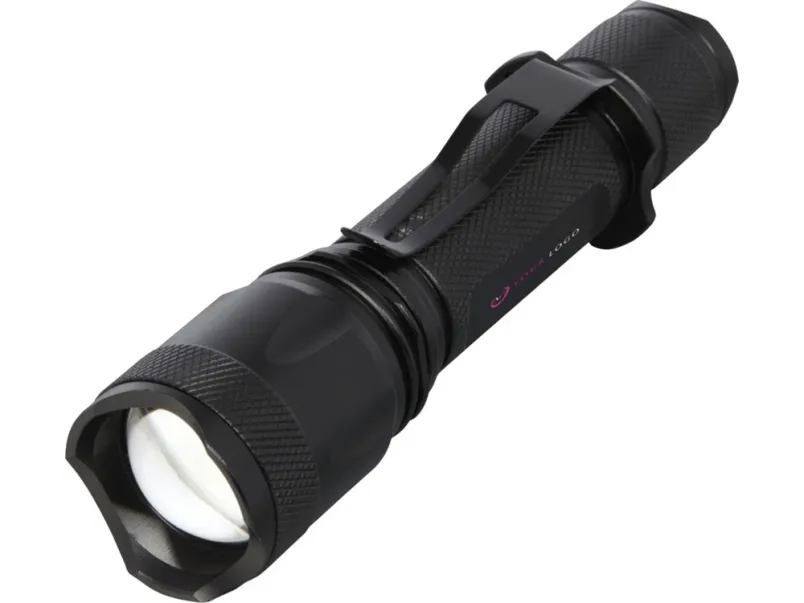 Благодаря этому перезаряжаемому мощному тактическому фонарю с алюминиевой конструкцией ваш аккумулятор никогда не разрядится. Прочный черный корпус из алюминиевого сплава выглядит по-военному и имеет ударопрочность до 1 метра. Фонарь имеет зажим для крепления на ремне и защиту от брызг по классу IPX4. Светодиод мощностью 5 Вт генерирует 300 люмен в течение 3 часов и луч дальностью 200 метров с 5 различными режимами освещения: высокий, средний, низкий, стробирующий и SOS. Высокая мощность обеспечивается встроенным литиевым аккумулятором емкостью 2000 мАч. Фонарь имеет размеры 14,5 x 3,4 см и весит всего 170 граммов. Поставляется с инструкцией по эксплуатации в подарочной коробке из переработанного картона размером 17,5 x 6 x 4 см. Рекомендуется нанесение на алюминиевый корпус лазерной гравировки. Алюминий.