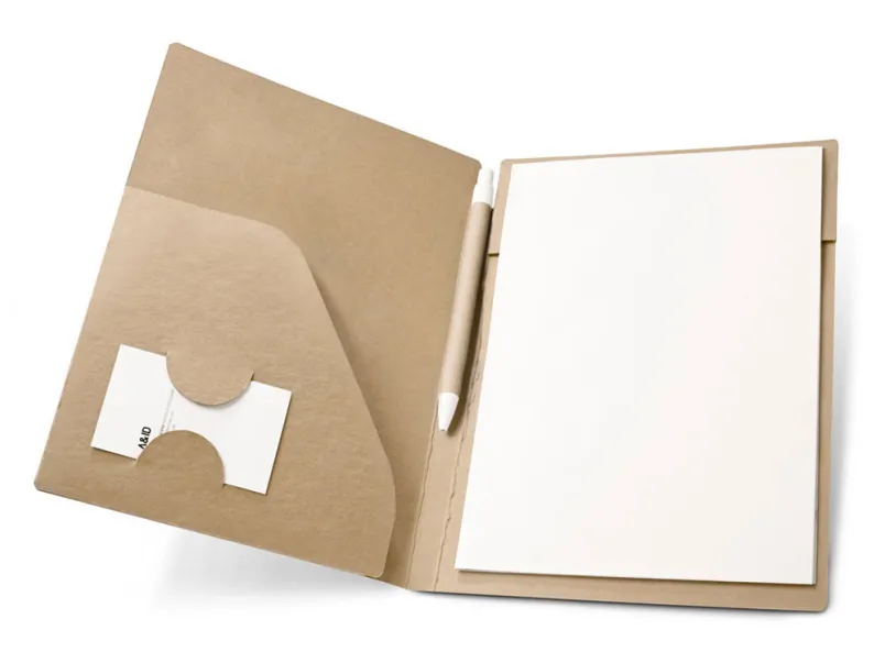 Папка из картона формата А5 (450 г/м²) с блокнотом из 20 чистых листов из переработанной бумаги и местом для крепления визитки. Ручка в комплекте. 168 x 230 x 15 мм.
