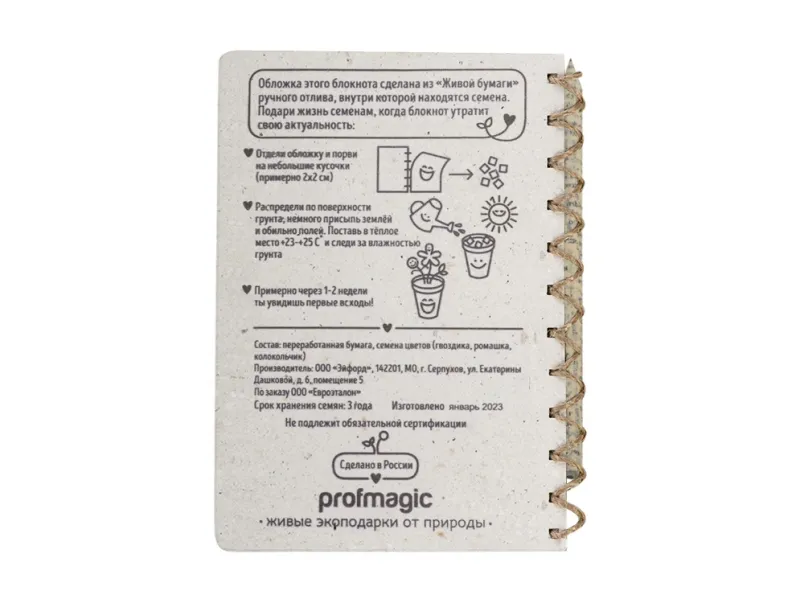 «Живой Блокнот» - это блокнот ручной работы с семенами цветов внутри обложки. Блок на 50 листов сделан из экологичной неотбеленной бумаги, вместо пружины используется льняной шпагат. Блокнот поставляется с бумажным карандашом в наборе. После использования блокнота, вырвите обложку, порвите ее на кусочки и посадите в землю. Поливайте, и уже через несколько недель вы увидите первые всходы.
