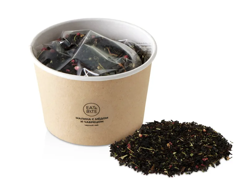 черный чай, листья ежевики, чабрец, кусочки сублимированной малины, ароматизатор натуральный "Малина", ароматизатор натуральный "Мед"