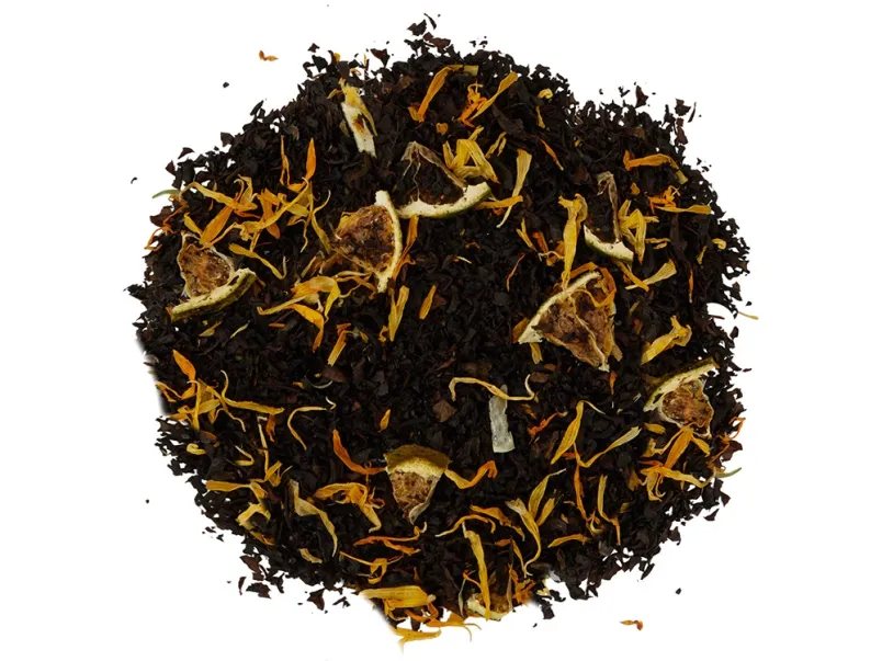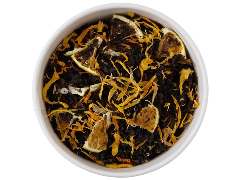 черный чай, лепестки календулы, слайсы мандарина, ароматизатор натуральный "Глинтвейн", ароматизатор натуральный "Мандарин"