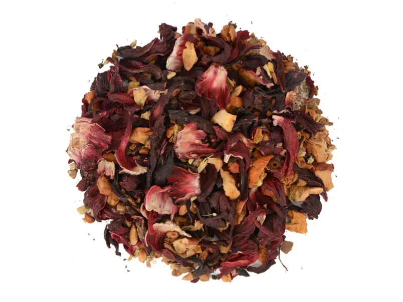 гибискус, кусочки яблока, шиповник, корица, имбирь, цедра апельсина, гвоздика