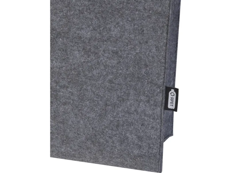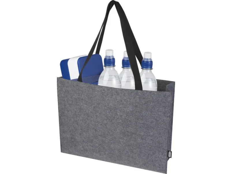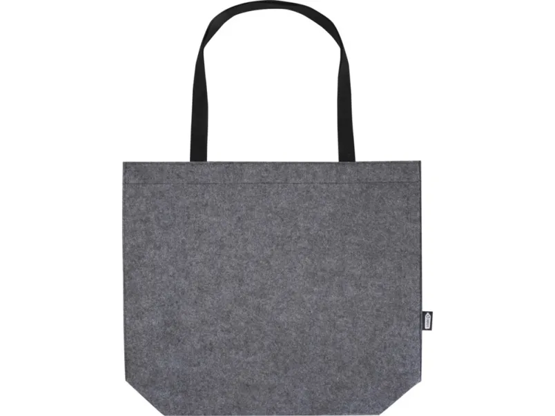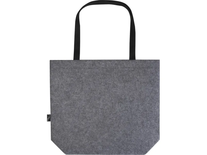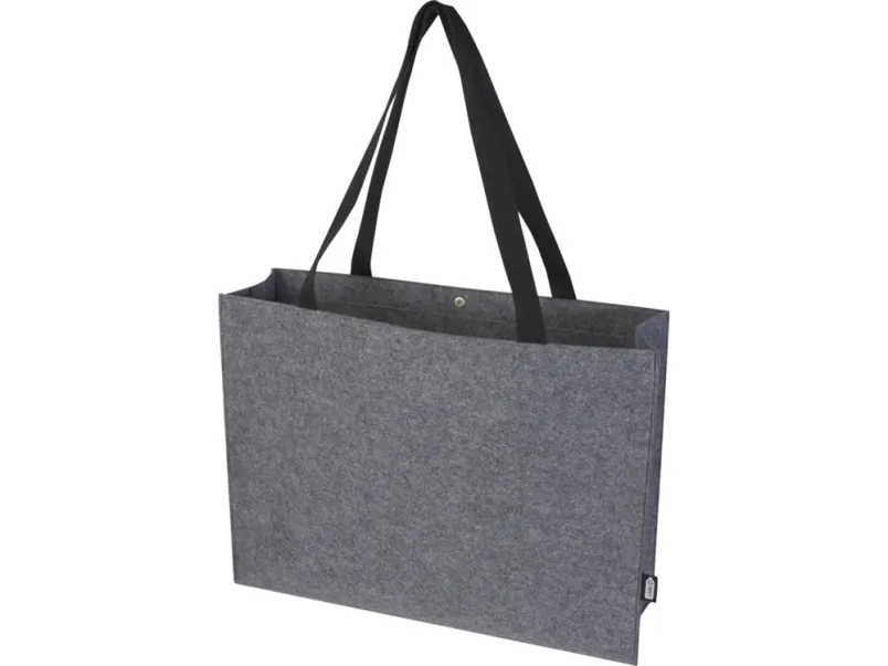 Большая эко-сумка с широким дном и боками из мягкого и прочного высококачественного переработанного фетра, сертифицированного согласно GRS. Сумка имеет большое основное отделение с объемом (до 20 литров), усиленные тканые хлопковые ручки (30 x 2,5 см) для оптимального удобства переноски и застежку-кнопку в верхней части. GRS certified recycled polyester.