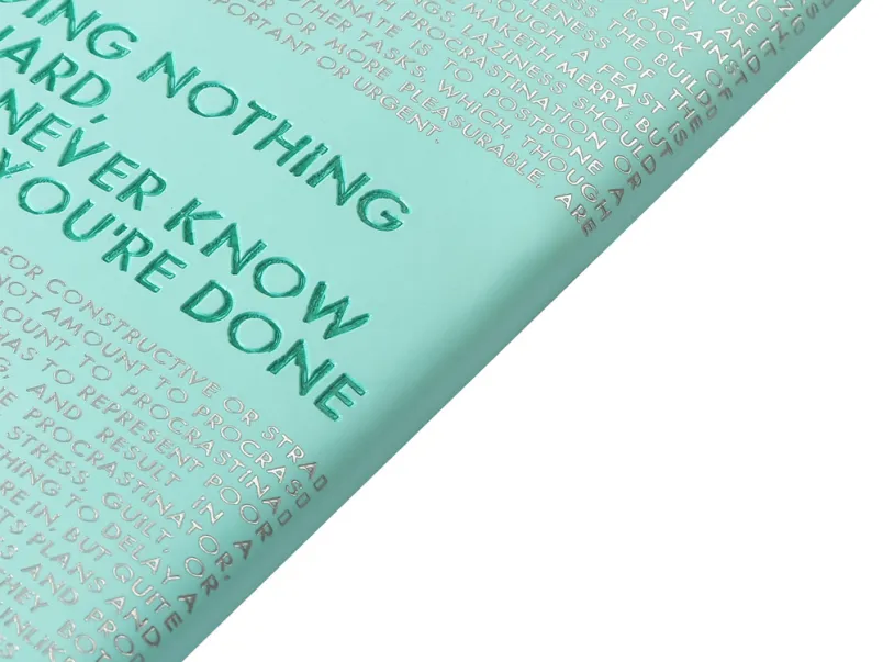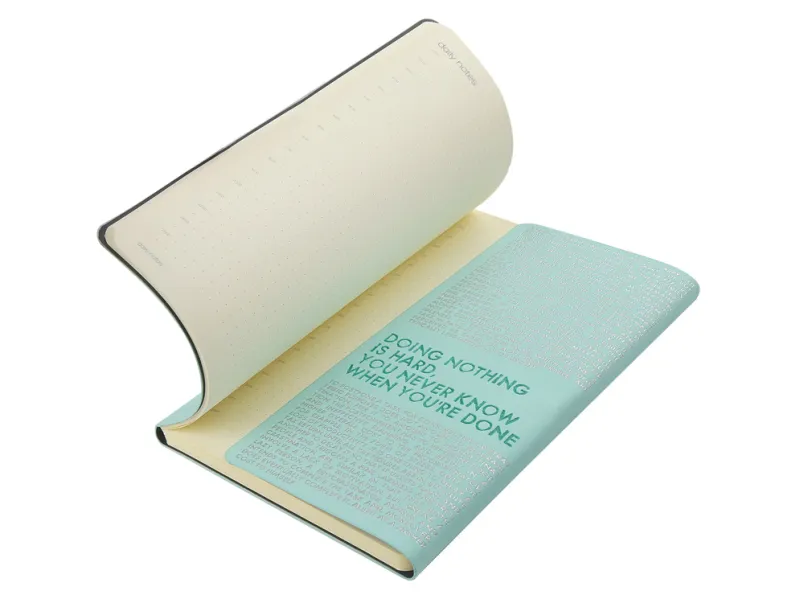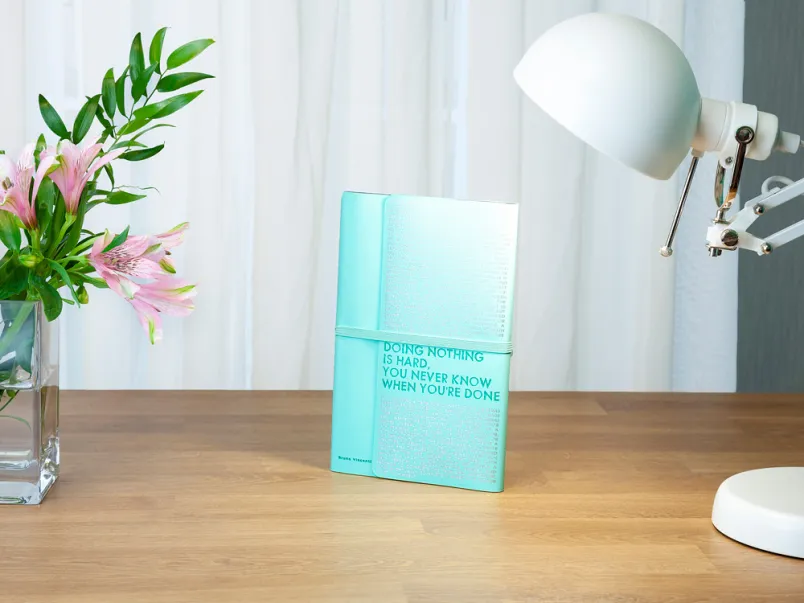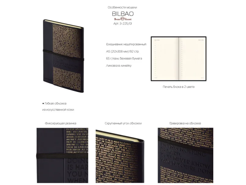 Так трудно ничего не делать, ведь совершенно непонятно, когда ты закончишь! Лаконичный слоган мотивирует к активным действиям. Планируй и завершай! Вот что кроется в элегантной надписи, выполненной золотым тиснением! А Flex обложка напоминает «Будь гибким! Великолепный недатированный ежедневник Bilbao черно-синего цвета с тиснением фольгой. Бежевая бумага 65 г/м, широкая горизонтальная фиксирующая резинка. Гибкая обложка с покрытием Soft-touch. Особенность этого ежедневника - часть обложки внахлест может использоваться как закладка. Ежедневник упакован в картонный полукороб и термопленку.