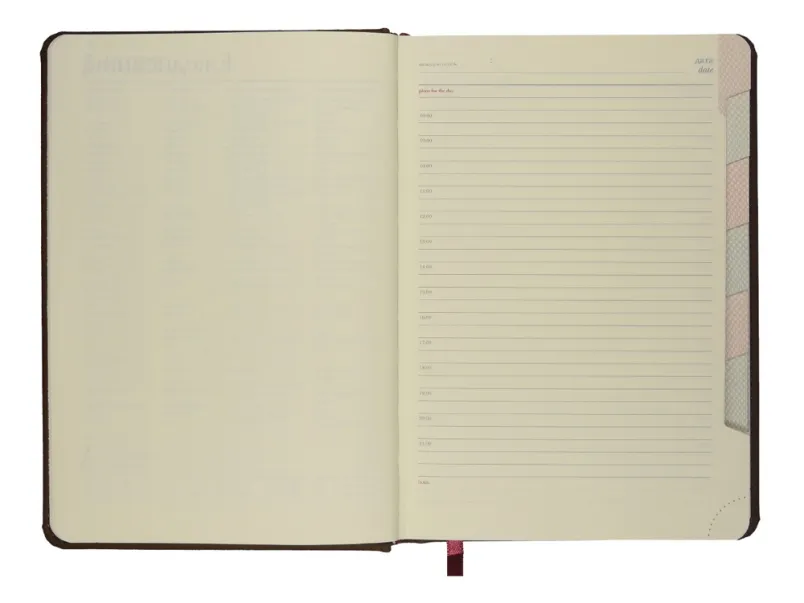 Незаменимый помощник в деле эффективного планирования благодаря высокому качеству производства и тщательно продуманных элементов: мягкая бархатистая обложка со скругленными уголками и строчкой по периметру в цвет, вырубные индексы с цветной маркировкой, разбивающей блок на месяцы, закладка-ляссе, перфорированные углы блока, линовка листов с указанием времени суток.