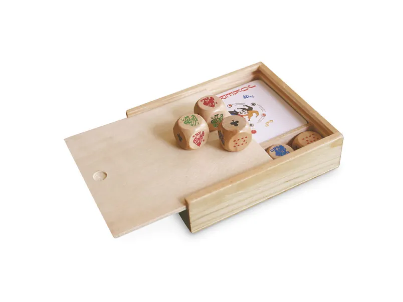 Игровой набор 2 в 1 с колодой карт и кубиками. Поставляется в деревянном ящике. 103 x 97 x 25 мм. Вид нанесения, рекомендуемый поставщиком: гравировка, трафаретная печать.
