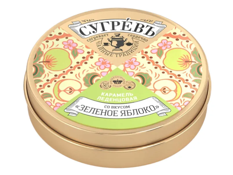 Необычная карамель в форме листика. Имеет натуральный и насыщенный вкус спелого яблока. Баночка весьма компактна, что позволяет поместить её в любой карман. Разработана по немецкой технологии. Состав: патока, вода, регуляторы кислотности (лимонная кислота, молочная кислота), ароматизаторы, идентичные натуральным, краситель: экстракт сафлора, Е131, сахар.