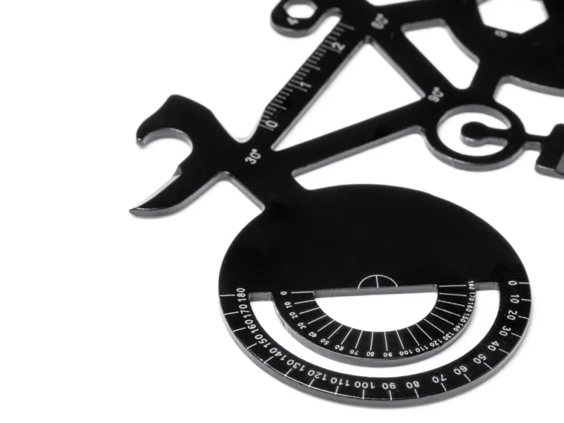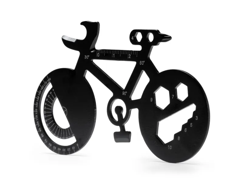 Многофункциональный инструмент из нержавеющей стали в форме велосипеда. 11 функций: открывалка для консервных банок, угловой транспортир, отвертки, гаечные ключи и линейки.