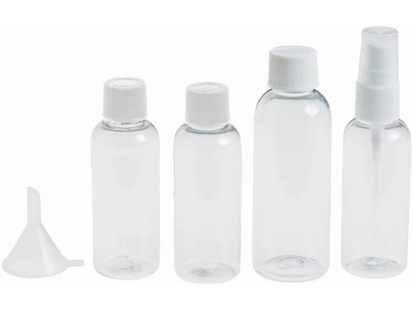 бутылка 50 мл- 2шт, бутылка 90 мл, пульверизатор 50мл, воронка, дорожный чехол