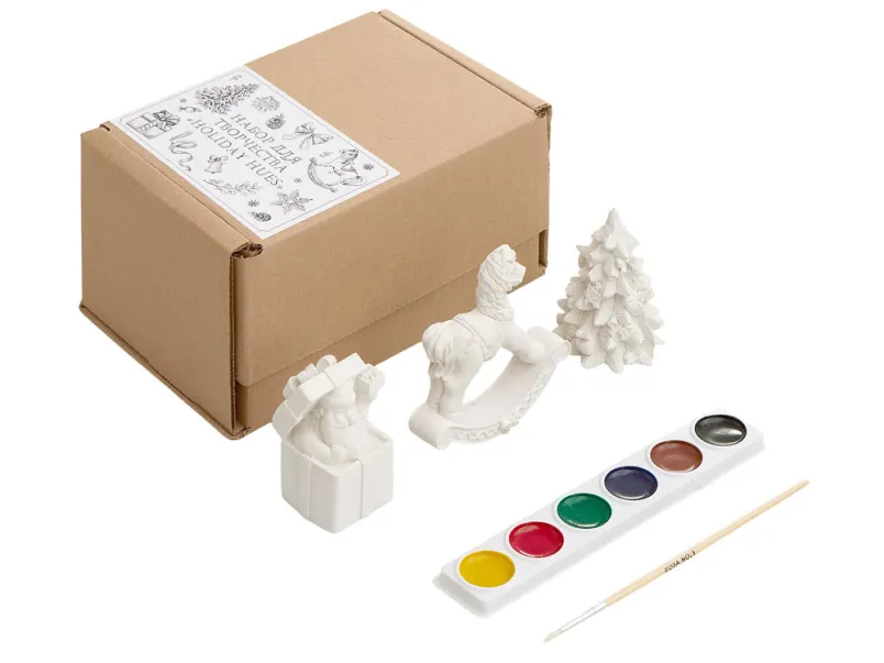 В набор входят три гипсовых фигурки — лошадка-качалка, елочка и подарочная коробка с Дедом Морозом, а также акварельные краски и кисть.