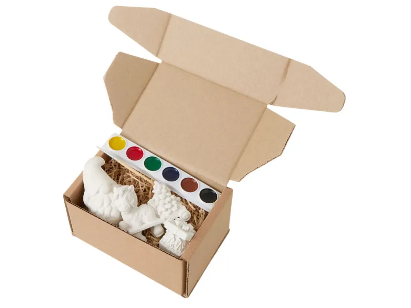 В набор входят три гипсовых фигурки — лошадка елочкой, гном подарочная коробка с пряничными человечками, а также акварельные краски и кисть.