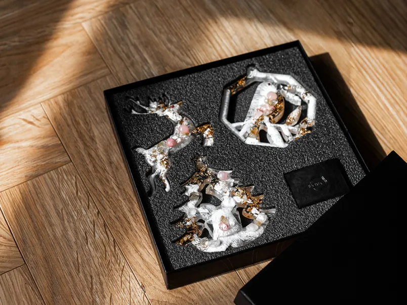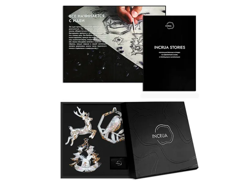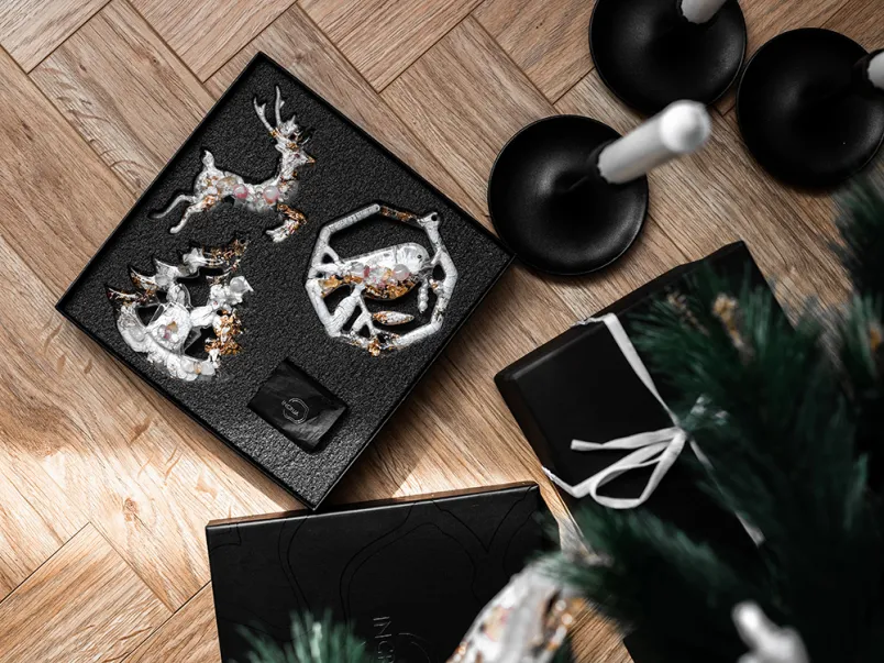 Игрушки бережно упакованы в стильную коробку из плотного премиального картона с индивидуальным ложементом, который надёжно фиксирует игрушку. Такой презент не требует дополнительной упаковки и готов порадовать своего обладателя. Для вашего удобства к каждой игрушке прилагается элегантная ленточка, с помощью которой вы легко сможете подвесить их на ёлку.