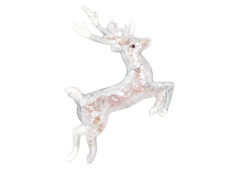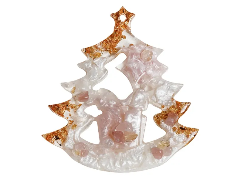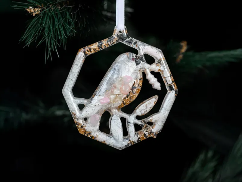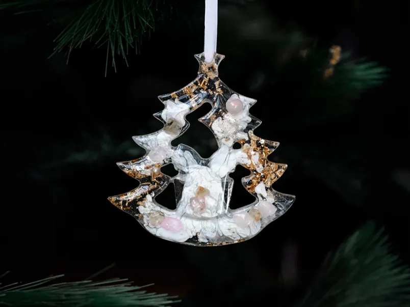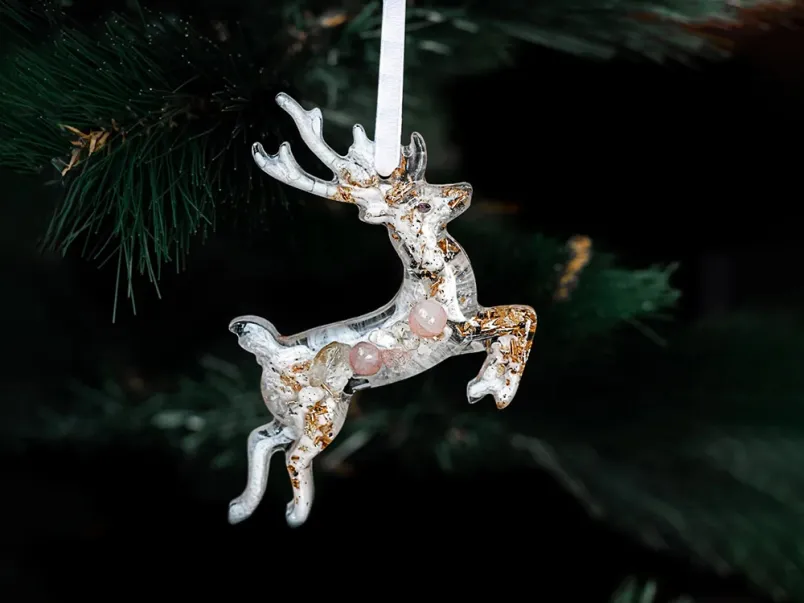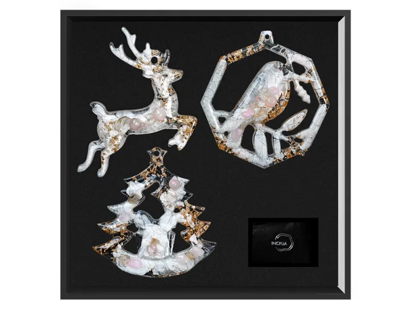 Набор из 3-х елочных игрушек: в форме оленя, снегиря и елки. Игрушки выполнены из ювелирной эпоксидной смолы и украшены галтовкой из натуральных минералов.
