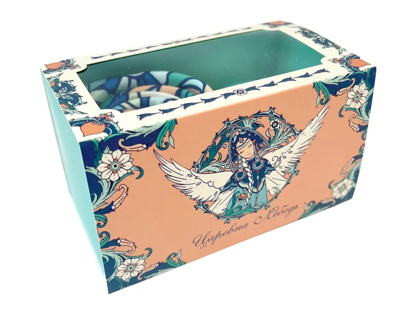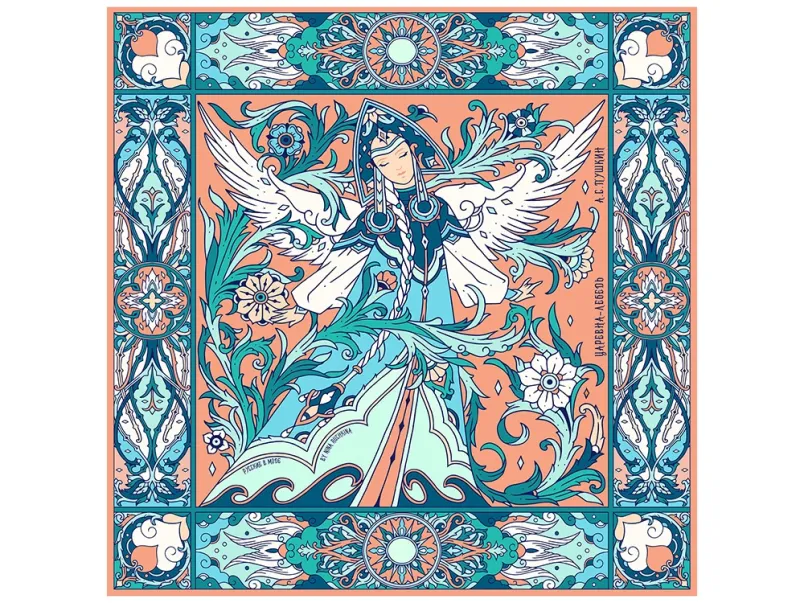 Платок «Царевна Лебедь» создан по мотивам сказочно-фольклорного мира А.С. Пушкина, где прекрасная Царевна воплощает добродетель, мудрость и чарующую красоту. Перевоплощаясь в птицу, она способна достичь небывалых высот и озарить мир своим великолепием.