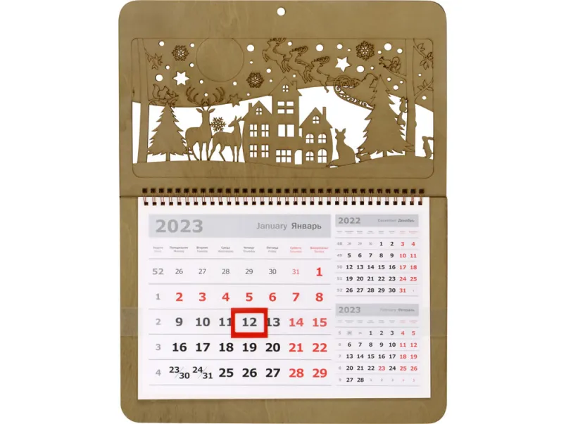 Настенный перекидной календарь имеет необычную «обложку», в роли которой выступают фанерные крышки. Нижняя крышка сплошная, верхняя — резная, ажурная, с вырезанным новогодним пейзажем и большим полем под нанесение логотипа или надписи, которая органично впишется в облик календаря.