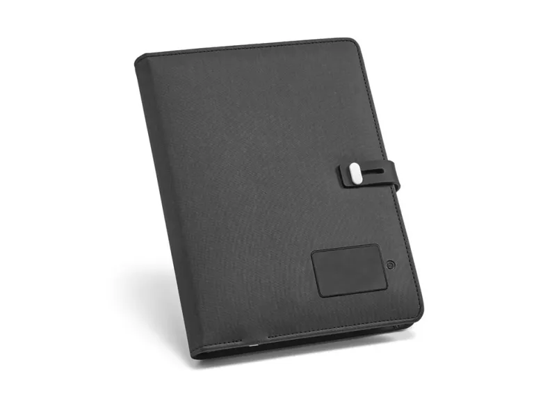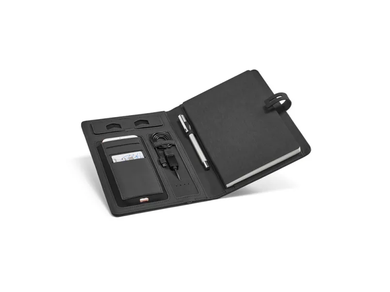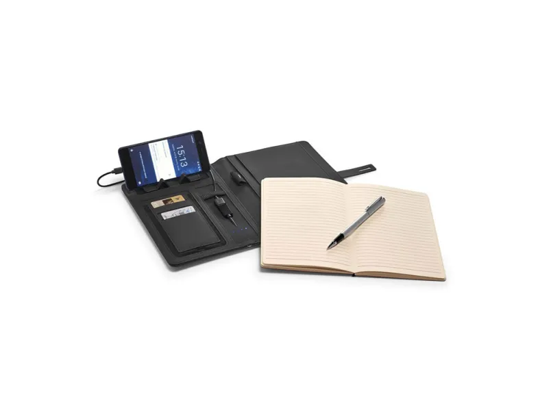 Папка формата A5 из искусственной кожи со встроенной портативной батареей. Литиевая батарея на 4000 mAh, срок службы ≥ 500 циклов, с входом/выходом 5 V/1 А и кабелем USB/micro USB для зарядки аккумулятора. Эта папка имеет держатель для шариковой ручки (не входит в комплект), съемный блокнот с 64 листами в линейку из слоновой кости, различные отделения для облегчения организации и крепитель для смартфона. Снаружи пластинка для персонализации с прорезиненным покрытием, внутренний LED и кнопка включения/выключения. Поставляется в подарочной упаковке. 165 x 225 x 25 мм | Пластинка: 55 x 35 мм | Коробка: 180 x 240 x 35 мм. Вид нанесения, рекомендуемый поставщиком: гравировка.