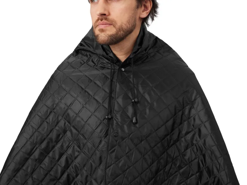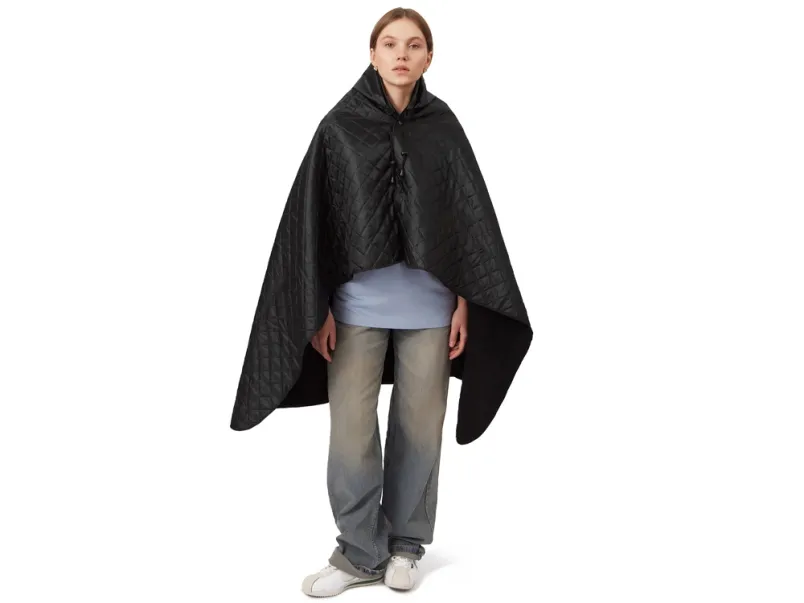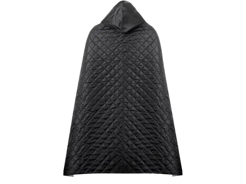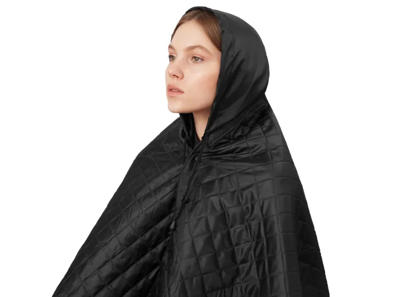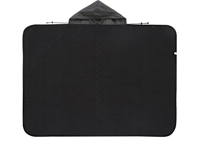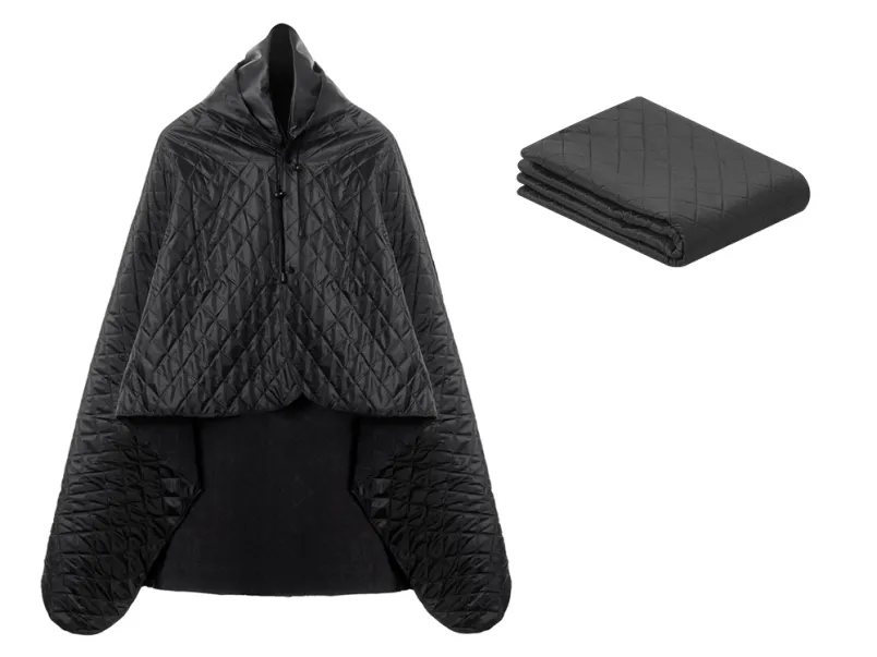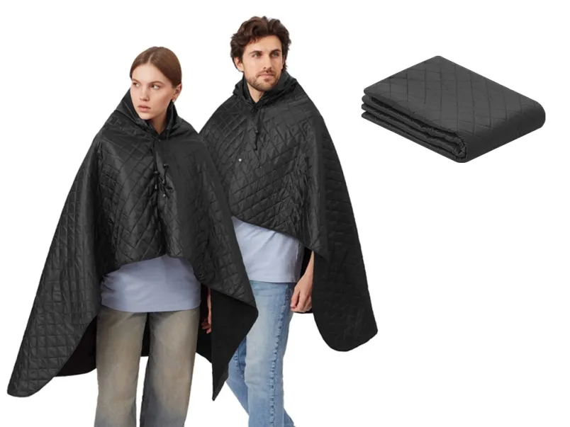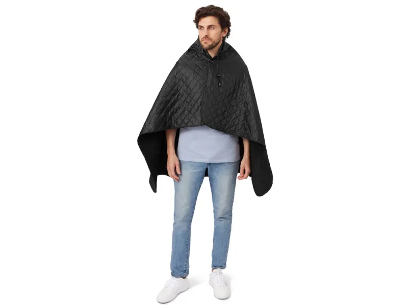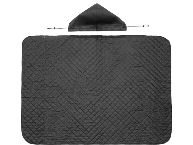 На внутренней стороне из флиса приятно и тепло сидеть, а наружная сторона из полиэстера с водоотталкивающим покрытием не позволяет пледу намокнуть или сильно испачкаться. Для больше удобства использования пледа во время дождя в комплекте идет капюшон, который фиксируется с помощью " липучки". Накинув плед на плечи, застегните его на кнопки вверху и наденьте капюшон. Вы не промокните во время неожиданного дождя!
