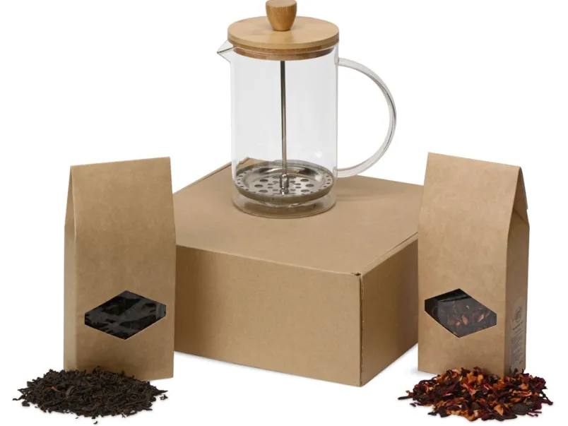 френч-пресс- прозрачный/натуральный, упаковка чай- крафт, наполнитель- зеленая липа