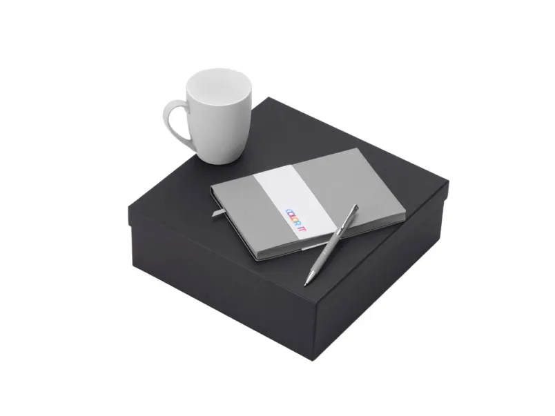 блокнот - искусственная кожа с покрытием soft-touch, ручка - алюминий с покрытием soft-touch, кружка - фарфор с покрытием soft-touch, коробка - картон