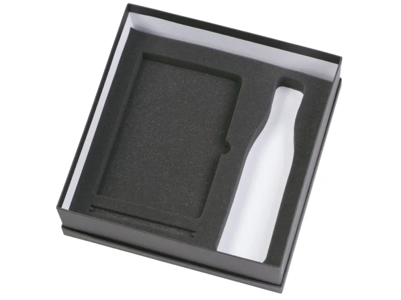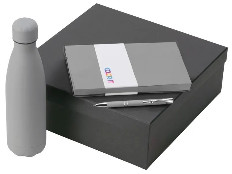блокнот - искусственная кожа с покрытием soft-touch, ручка - алюминий с покрытием soft-touch, термобутылка - нержавеющая cталь с покрытием soft-touch, коробка - картон
