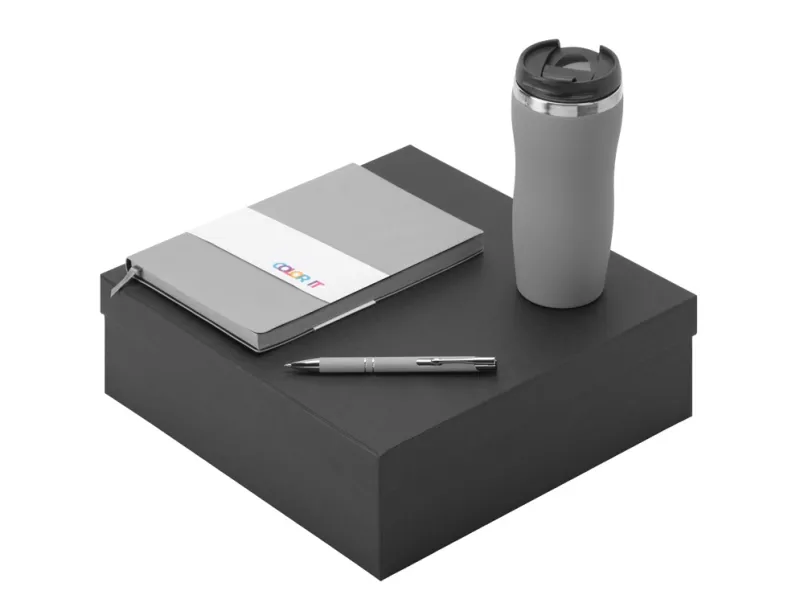 блокнот - искусственная кожа с покрытием soft-touch, ручка - алюминий с покрытием soft-touch, термокружка - нержавеющая cталь с покрытием soft-touch, коробка - картон