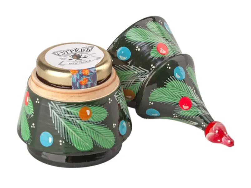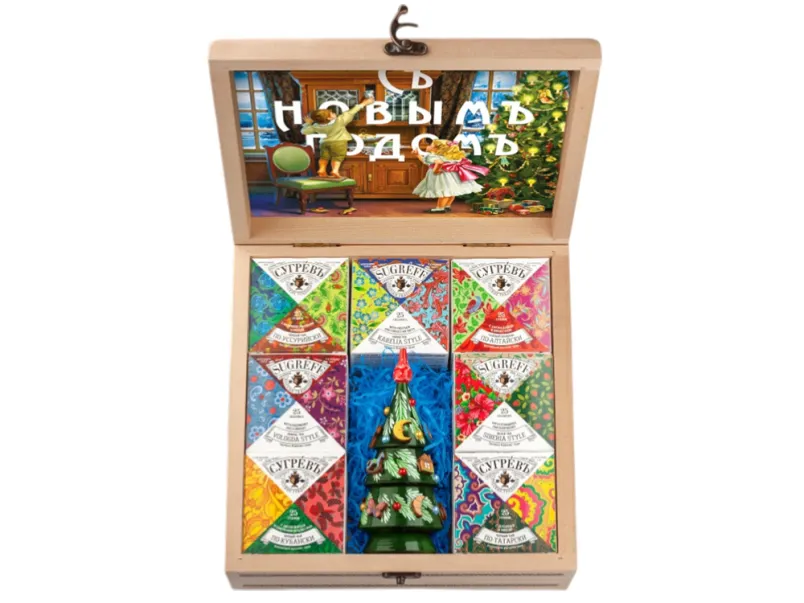 Подарочный набор из семи эксклюзивных купажей листового чая, характерных для разных регионов России и елки ручной работы с натуральным вареньем, в сувенирной шкатулке из массива берёзы.
