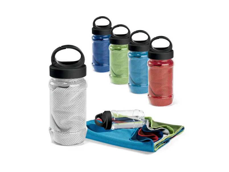 Набор в PP и PET состоящий из бутылки и полотенца для спорта из полиамида и полиэстера. Бутылка с крючком, практична для транспортировки с собой куда угодно, с емкостью до 440 мл. Данное полотенце остается прохладным в течение нескольких часов, когда мокрое. Если нагреется, достаточно встряхнуть его, и оно станет прохладным. Полотенце для многоразового использования, можно стирать в стиральной машине. Полотенце 300 x 800 мм, бутылка ø65 x 183 мм