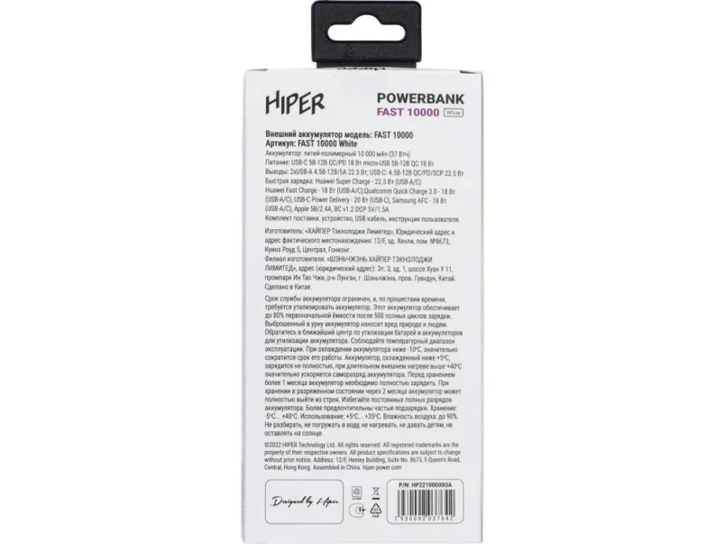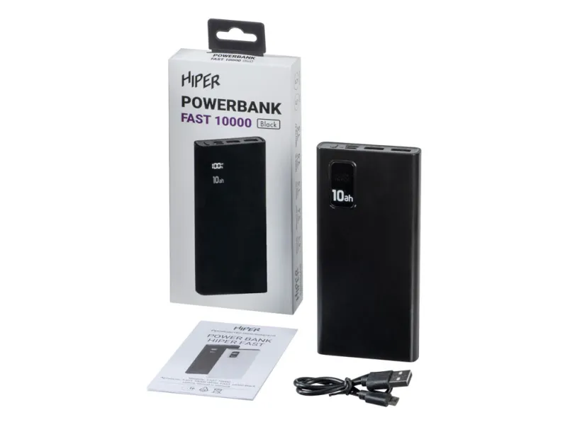 Портативный внешний аккумулятор HIPER FAST 10000 емкостью 10000 мАч (37Втч) оснащён двунаправленным портом USB-C, Micro-USB входом для зарядки, с поддержкой быстрой зарядки аккумулятора QC и PD, 2xUSB-A выходами, максимальный выходной ток 5А, максимальная мощность 22,5 Вт, поддержка быстрой зарядки стандарта QC 18 Вт, поддержка быстрой зарядки стандарта PD 18 Вт, стильный дизайн.