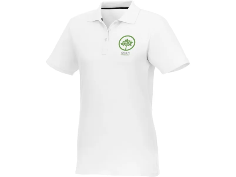 Женское поло Helios с коротким рукавом. Женская модель с разрезами по бокам. Отрезной-отрывной ярлык для комфорта. Воротник гладкой вязкой в рубчик. Планка с тремя пуговицами. Двойная строчка на воротнике и внизу изделия. Пуговицы в цвет изделия. Полоска на горловине в контрастном цвете. Трикотаж Piqué, 100 % хлопок. 180 г/м².