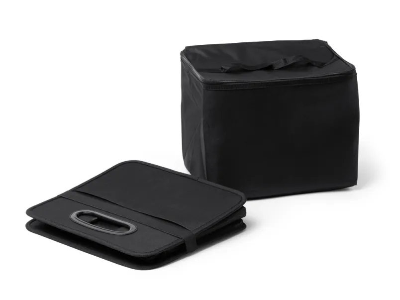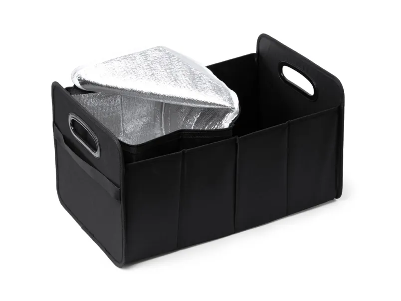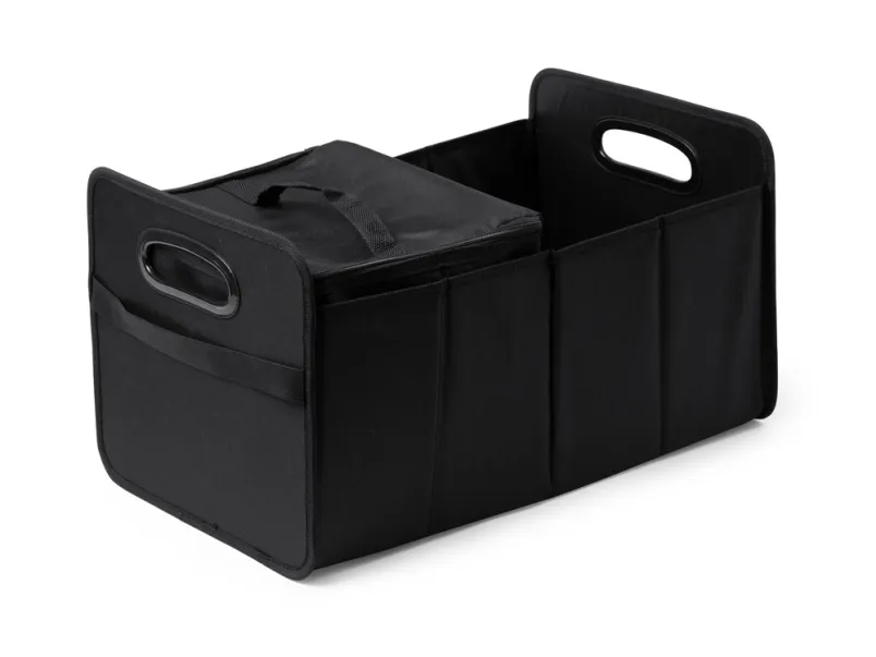 Складной органайзер для автомобиля из полиэстера 600D с усиленными ручками. Два основных отсека и внешний карман. Включает в себя съемный охладитель объемом 12 л с изотермической подкладкой.