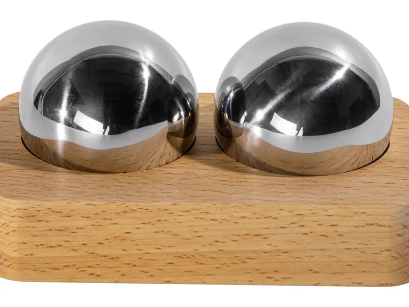 Набор состоит из двух сфер, выполненных из нержавеющей стали, и подставки из дерева, которая позволяет хранить их надлежащим образом и не дает укатываться с полки.