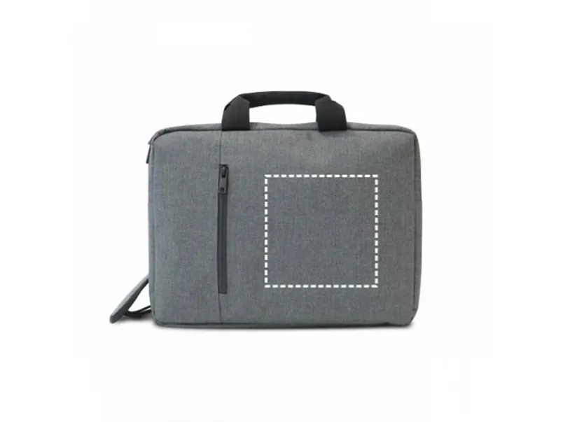SHADES LAPTOP. Сумка для ноутбука 14'', Серый. Сумка для ноутбука из полиэстера 600D высокой плотности. Основное отделение с подкладкой и набивкой, а также мягкой перегородкой для ноутбука с диагональю до 14''. Передний карман и ремень для крепления к чемодану. Регулируемые плечевые шлейки с набивкой. Вид нанесения, рекомендуемый поставщиком: трансфер