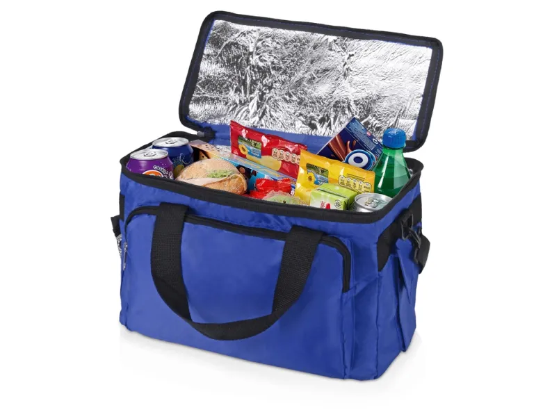 Вместительная сумка-холодильник (объем – 15 л.) «Камайоре» прекрасно подойдет не только для индивидуальных пикников, но даже и для доставки горячих продуктов (пиццы, например). С боков 2 кармана – один сетчатый с регулируемой затяжкой для бутылки. Другой для приборов, салфеток или других мелочей закрывается на липучку. Наружный слой сделан из полиэстера, на него может быть нанесена персонализация: имя владельца или логотип компании.