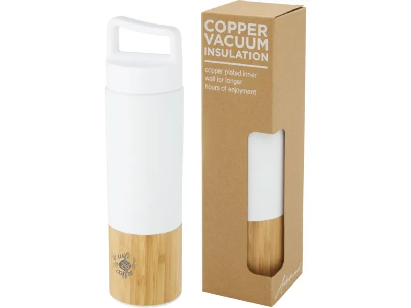 Термобутылка из нержавеющей стали 18/8 с медной вакуумной изоляцией, которая сохраняет напитки горячими или холодными в течение нескольких часов. Имеет модный элемент из бамбука; бутылку легко носить с собой благодаря ручке на верхней части крышки. Бутылка имеет широкое горлышко, поэтому ее легко наполнять и мыть. Протестировано и одобрено согласно немецкому законодательству о безопасности пищевых продуктов (LFGB), а также проверено на содержание фталатов согласно нормам REACH. Объем 540 мл. В коробке из переработанного картона. Нержавеющая сталь, бамбук.